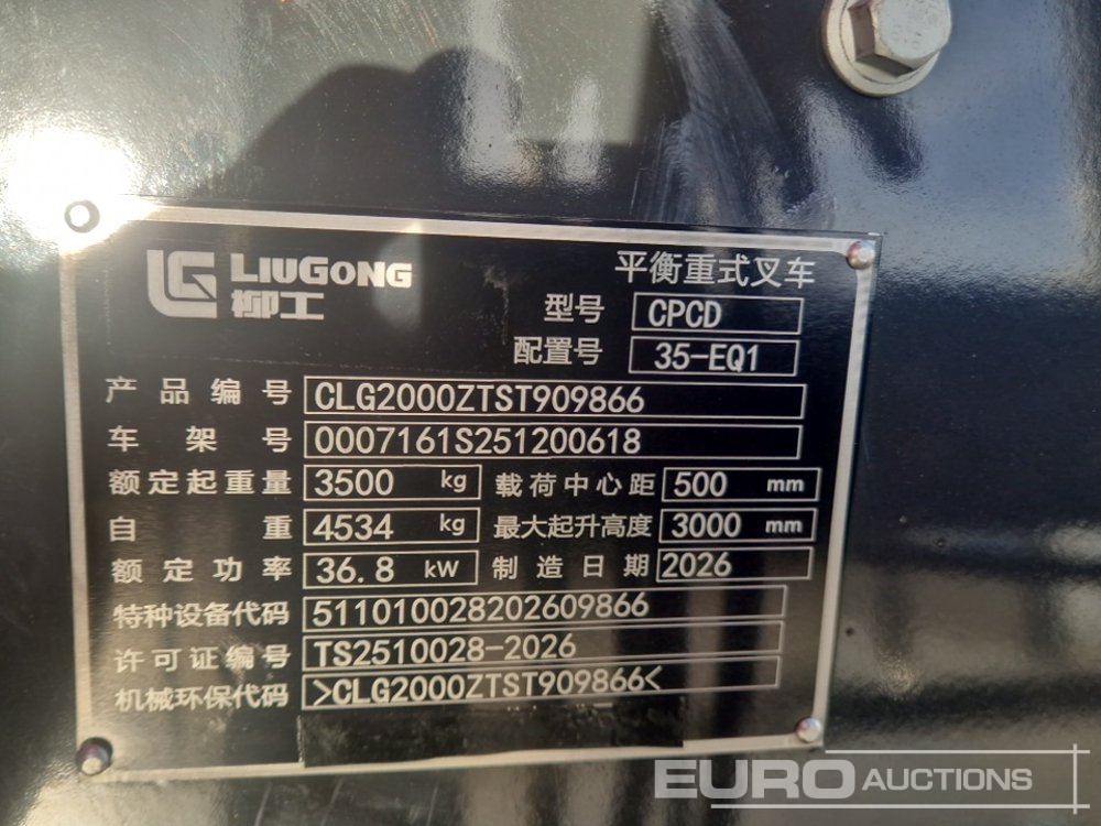 Unused 2026 Luigong CPCD35 3.5 Ton Diesel Forklift, 2 Stage Mast Lift, Side Shift, Forks - CLG2000ZTST909866