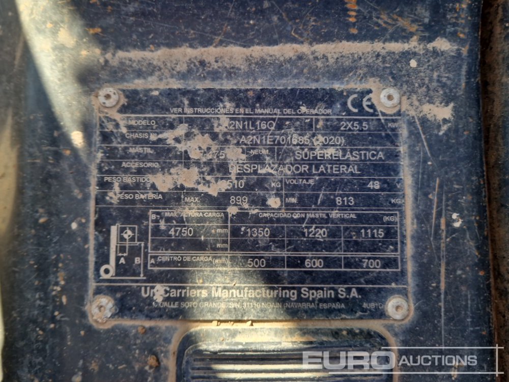 2020 UniCarriers A2N1L16Q 2.5 Electric Forklift, 3 Stage Free Lift Mast, Side Shift, Charger, Forks - A2N1E701685
