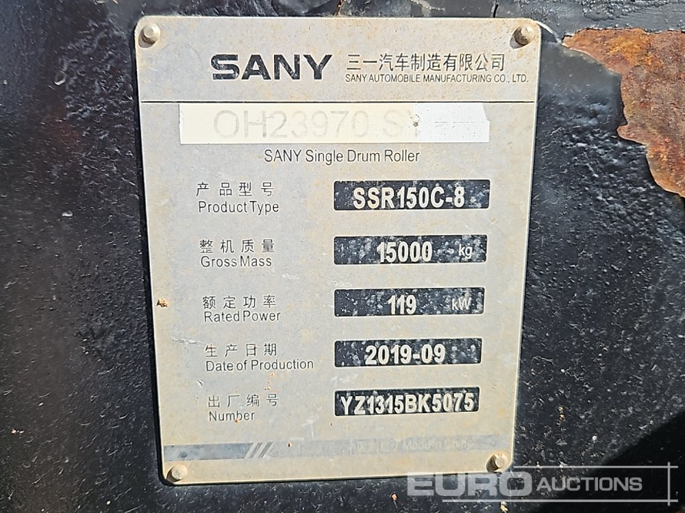 2019 Sany SSR150C-8 Single Drum Padfoot Roller, Reverse Camera, Fire Extinguisher, E-Stops, A/C (Hour Meter Shows 1,206hrs) - YZ1315BK5075