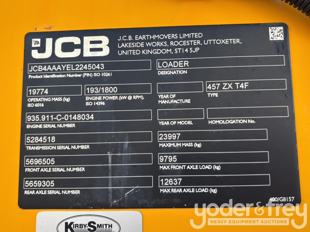 2020 JCB 457ZX Wheeled Loader, Cab, Bucket, QC (Meter Reading: 7050 Hours) - JCB4AAAYEL2245043