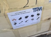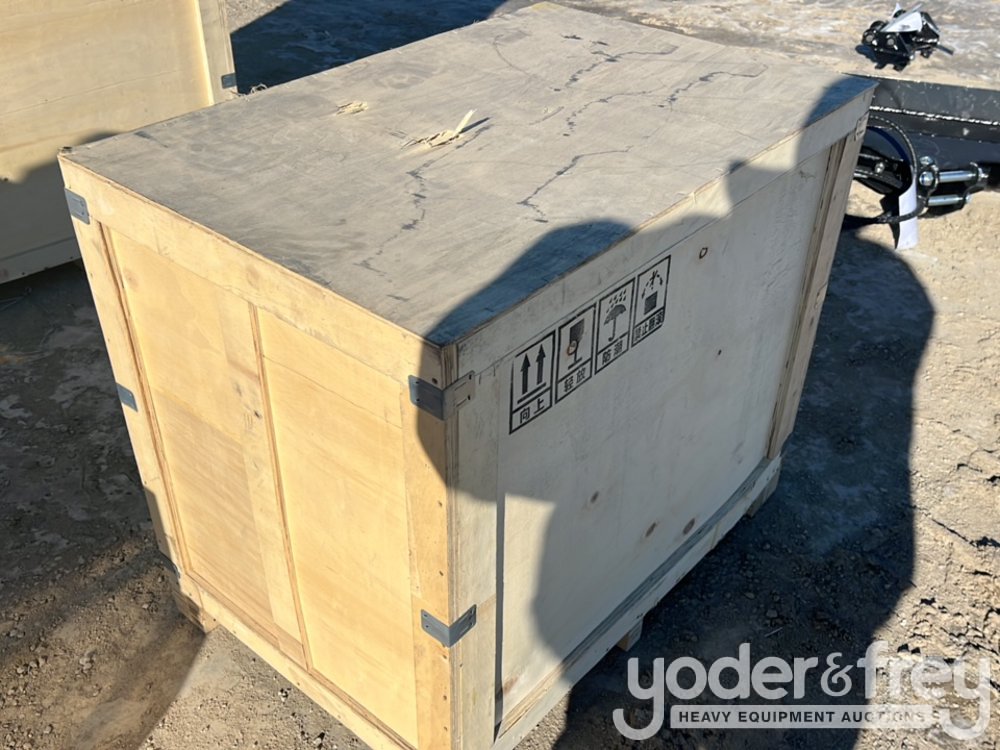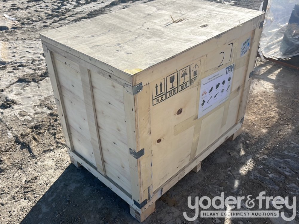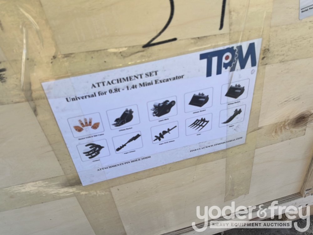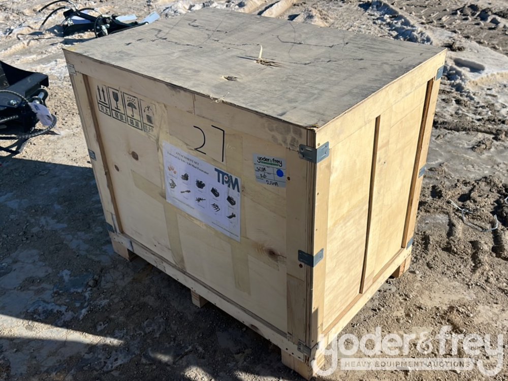 Unused TPM 10pc Attachments Incl. 5pc Bucket Teeth c/w bolts and nuts, 8" Bucket, 24" Bucket, 32" Bucket, Rippe, Rake, Quick Hitch, 8" Dia. Auger, 12" Dia. Auger Rod, Grabber In Wooden Box to suit 0.8-1.4 Ton Mini Excavators - 540021649
