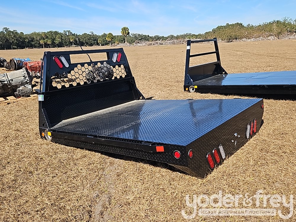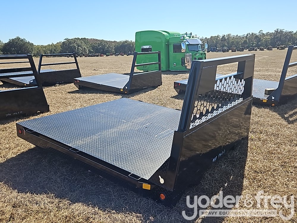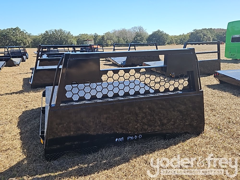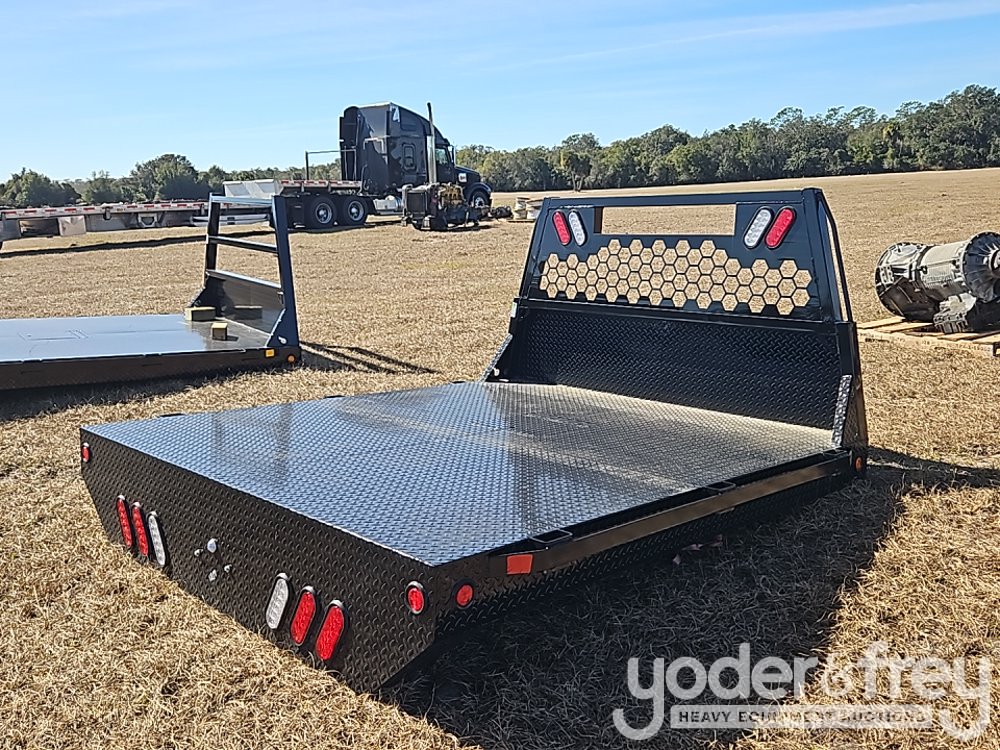 Economy Line Diamond Plate Flatbed Single Wheel Short Bed- Ford Honeycomb Headache Rack c/w 3/4" Solid Grab Rails and LED Lights, Stake Pockets, Rub Rails on Both Sides, Rear Bed Squared, 89" x78" 42" Runners/ One Door Drivers Side Front - 1217