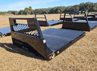 Economy Line Diamond Plate Flatbed Single Wheel Short Bed- Ford Honeycomb Headache Rack c/w 3/4" Solid Grab Rails and LED Lights, Stake Pockets, Rub Rails on Both Sides, Rear Bed Squared, 89" x78" 42" Runners/ One Door Drivers Side Front