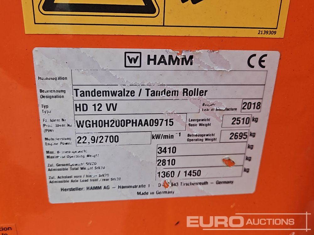 2018 Hamm HD12VV Double Drum Vibrating Roller, Roll Bar (Meter Reading: 680 Hours) - WGH0H200PHAA09715