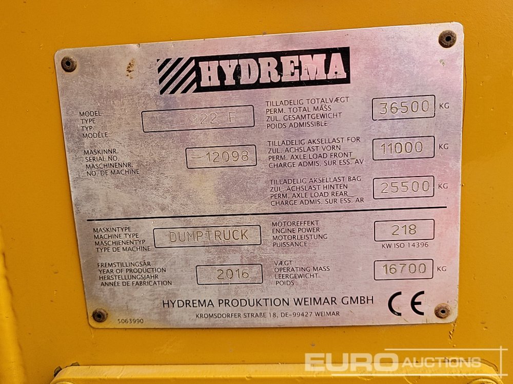 2016 Hydrema 922F 6x6 Articulated Dumptruck, Tailgate, Reverse Camera, A/C - 12098