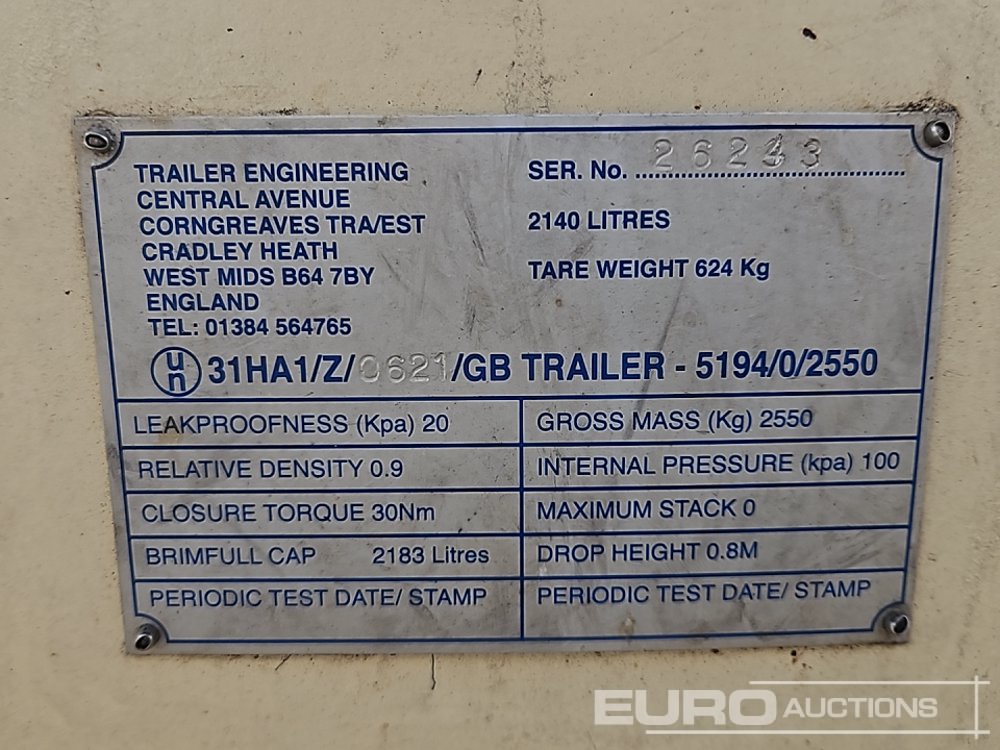 Trailer Engineering 2140 Litre Single Axle Bunded Fuel Bowser, Electric Pump