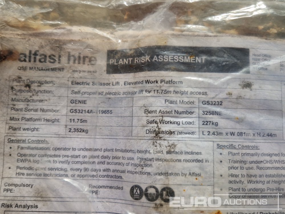 2014 Genie GS3232 Electric Narrow Scissor Lift, 11.75m Working Height, 227kg Platform Capacity, Extending Deck, Non Marking Tyre - GS3214A-119655