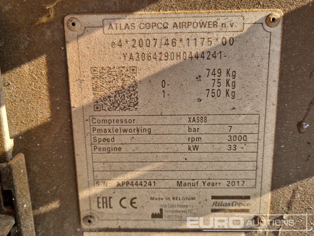 2017 Atlas Copco XAS88KD Single Axle Compressor (Polish Reg. Docs. Available) - YA306429H0444241