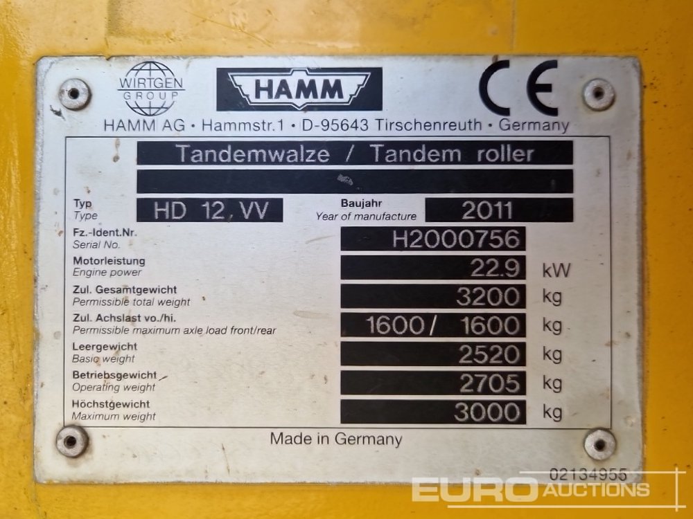 2012 Hamm HD12 VV Double Drum Vibrating Roller, Roll Bar - H2000756