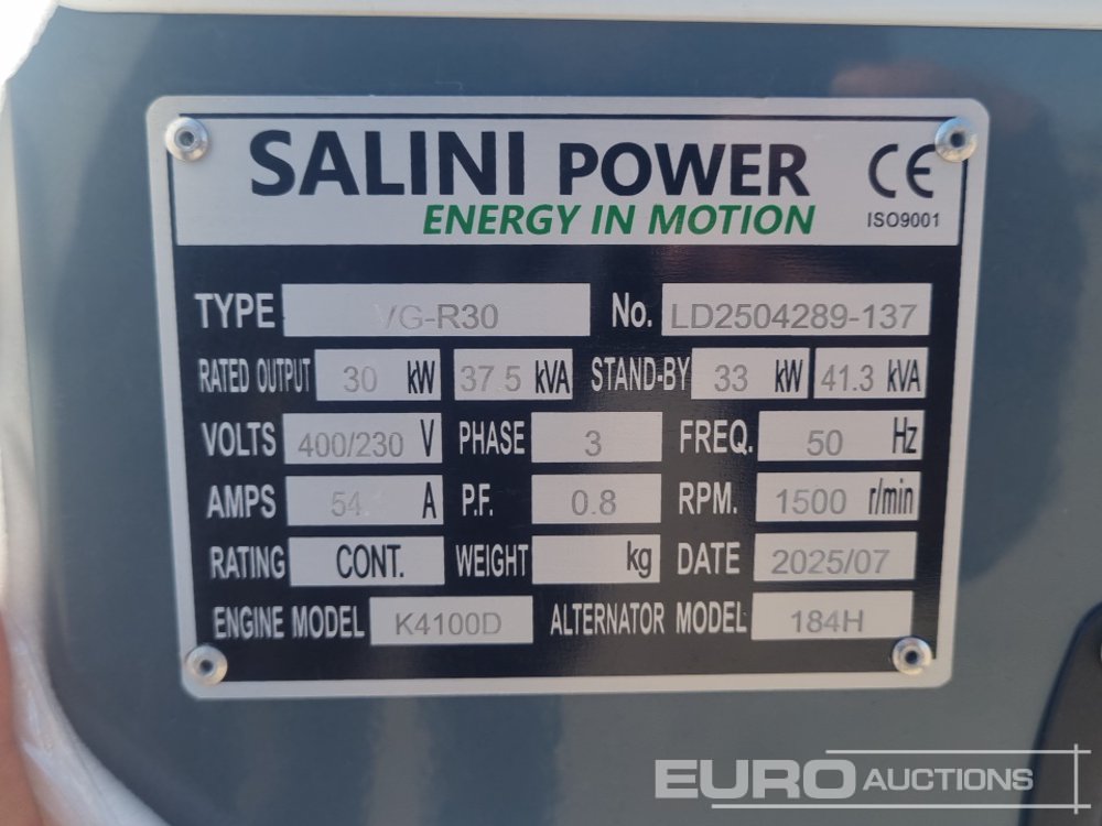 Unused Salini VG-R30 41.3KvA Generator, 4 Cylinder Engine / Generador Estático - LD2504289137