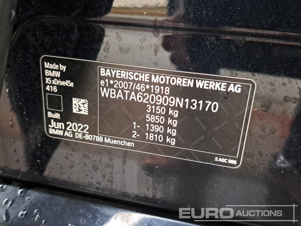 2022 BMW X5 45E M-Sport Hybrid Auto, Leather, Cruise Control, Sat Nav, Bluetooth, Reverse Camera, A/C (Reg. Docs. Available, Tested 08/26) (PLUS VAT) - FV22 VRL - WBATA620909N13170