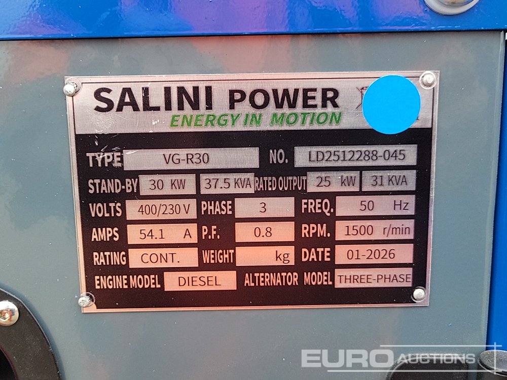 Unused 2026 Salini VG-R30 37.5kVA Generator, 4 Cylinder Engine - LD2512288045
