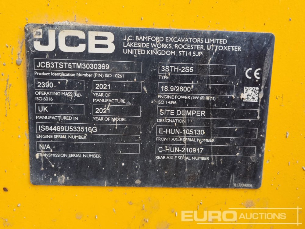 2021 JCB 3T-2 3 Ton Swivel Skip Dumper, Roll Bar (Reg. Docs. Available) (Meter Reading: 374 Hours) - YT21 RLZ - JCB3TST5TM3030369
