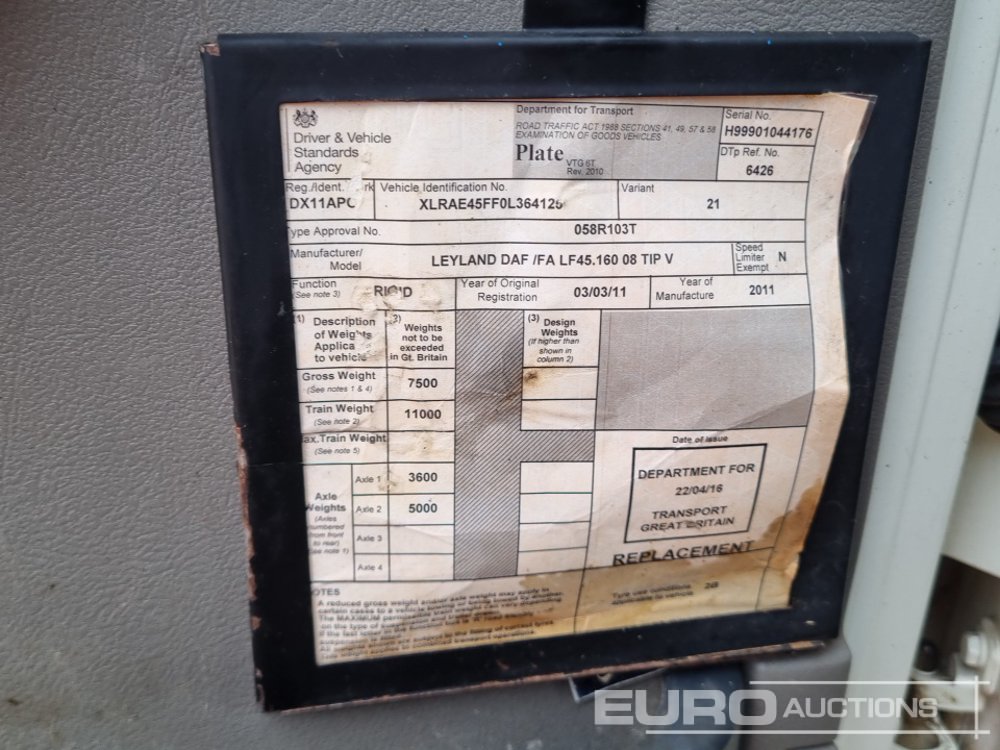 2011 DAF 45.160 4x2 Dropside Tipper Lorry, Manual Gearbox (Reg. Docs. Available, Tested 07/26) - DX11 APO - XLRAE45FF0L364125