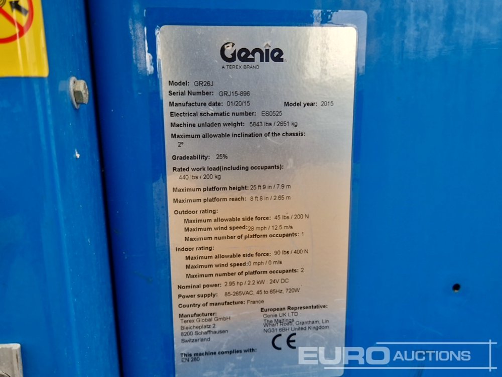 2015 Genie GR-26J Electric Vertical Mast Lift, 10m Working Height, 200kg Platform Capacity (Copy of Declaration of Conformity Available / Copia de CE Disponible) (Meter Reading: 380 Hours) - GRJ15-896