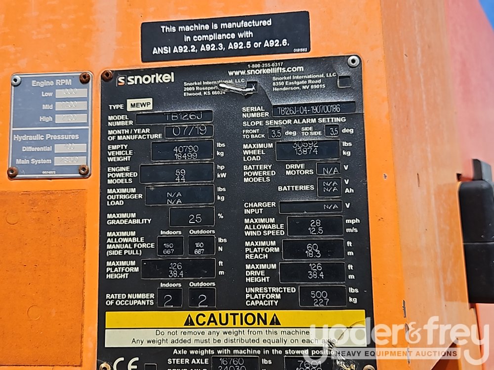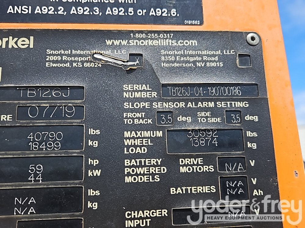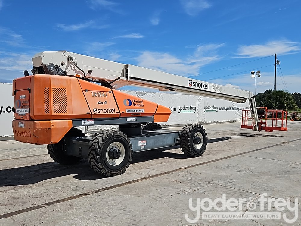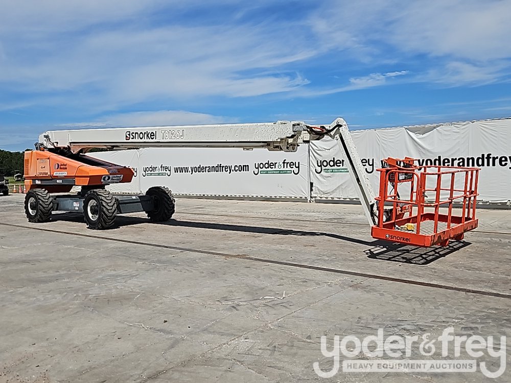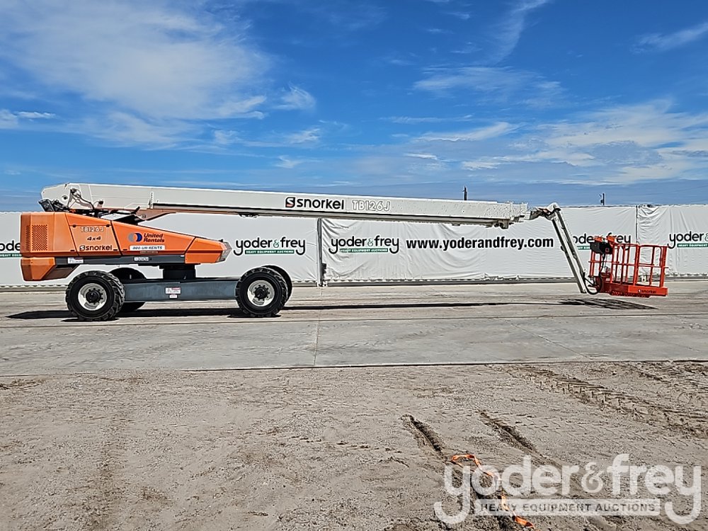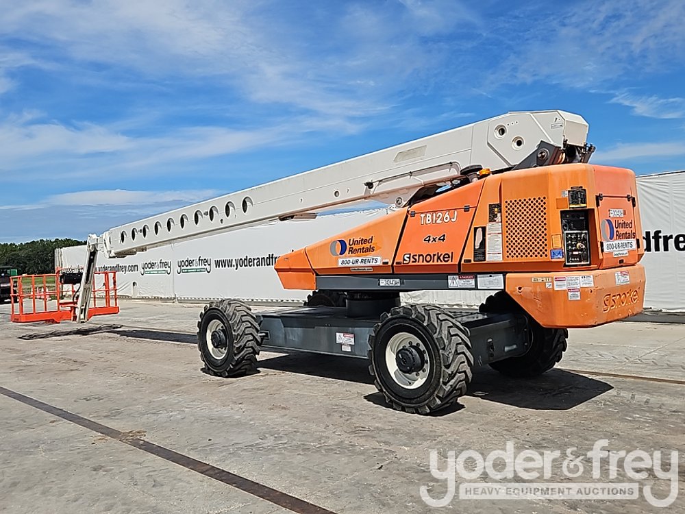 2019 Snorkel TB126J 126' Telescopic Boom Lift, 62' Horizontal Reach, With Jib, DSL, 4WD, 500 lbs max capacity, power to platform, proportional controls, oscillating axle (Meter Reading: 1727 Hours) - TB126J-04-190700186